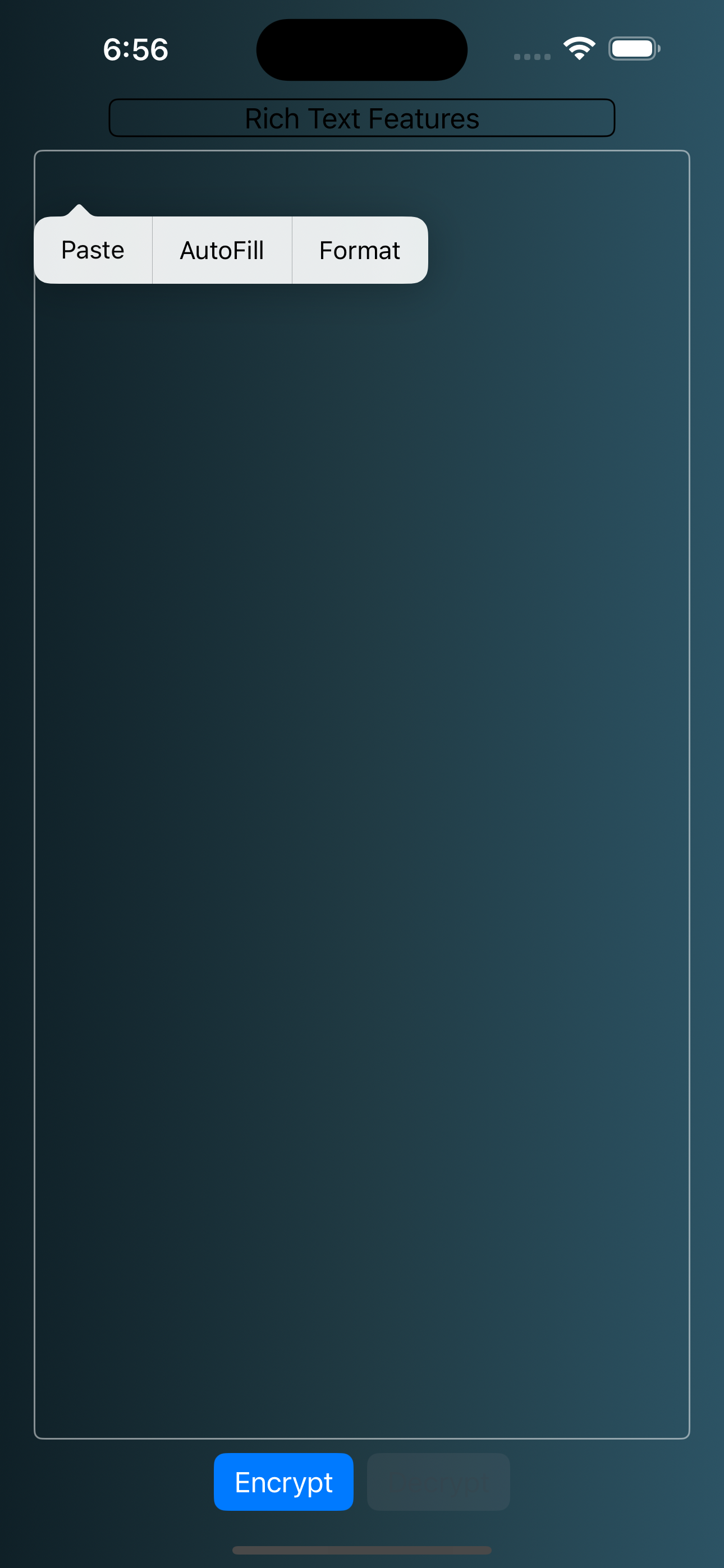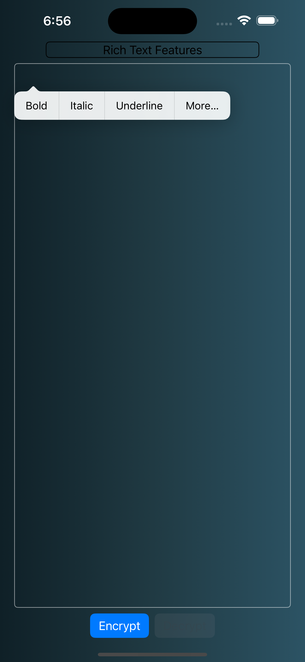 With your keys generated successfully, the rest of the heavy lifting is done by ghostmemo itself. The home screen allows for you to create/edit new memos and their editor has simple "encrypt" and "decrypt" buttons. It feels important to note that biometric authenticaton is not required to encrypt, but is required to decrypt.