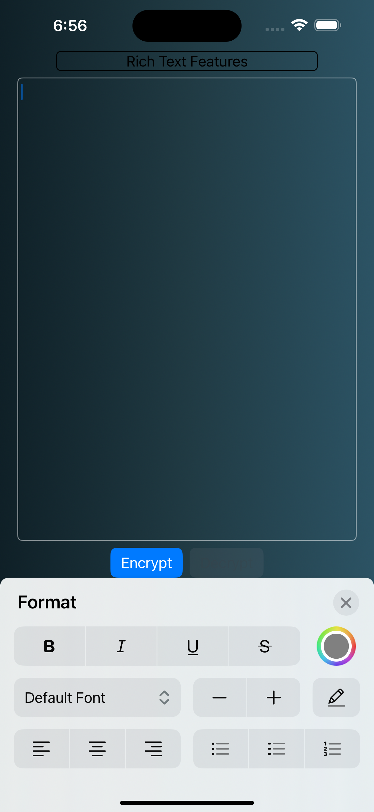 By selecting "format" in the initial context menu and then selecting "more", you are able to bring up a more fully featured keyboard to style your text. ghostmemo stores text in a form of attributed string, allowing your styling and formatting to remain even after being passed through multiple layers of encryption.